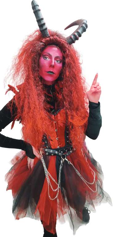 Diablica/Čertica Sukuba Veľkosť XS-M Požičanie 20€ Kostým zahŕňa: semišový overal (veľkosť XS-S), tylová sukňa (XS-M), korzet (XS-M nastaviteľný), opasok s reťazami, pierkový golier, parochňa, rohy a rukavice s pazúrmi.